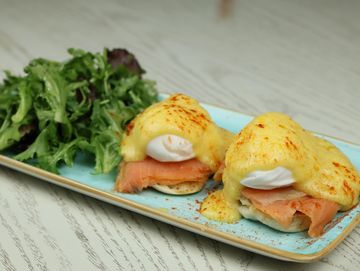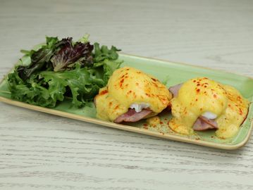 Toasted English Muffin Topped with Poached Eggs, and Creamy Hollandaise Sauce. Served with a Fresh Mixed Green Salad