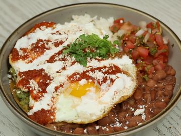 Crispy Tortilla Chips, simmered in a Spicy Red Sauce Topped with Cheese, Sour Cream, Guacamole, Topped with a Fried Egg